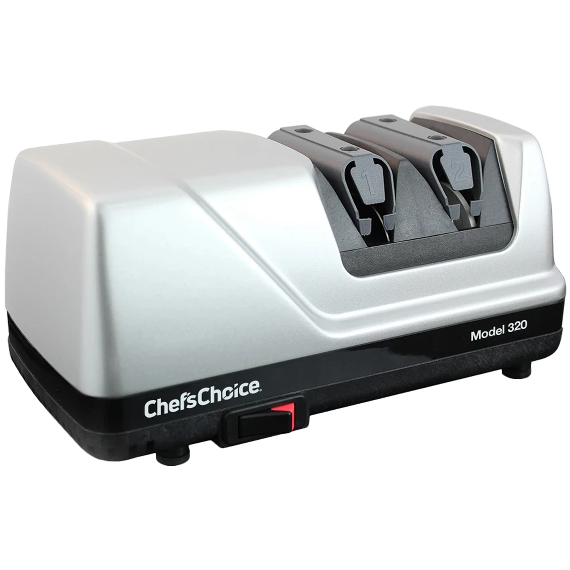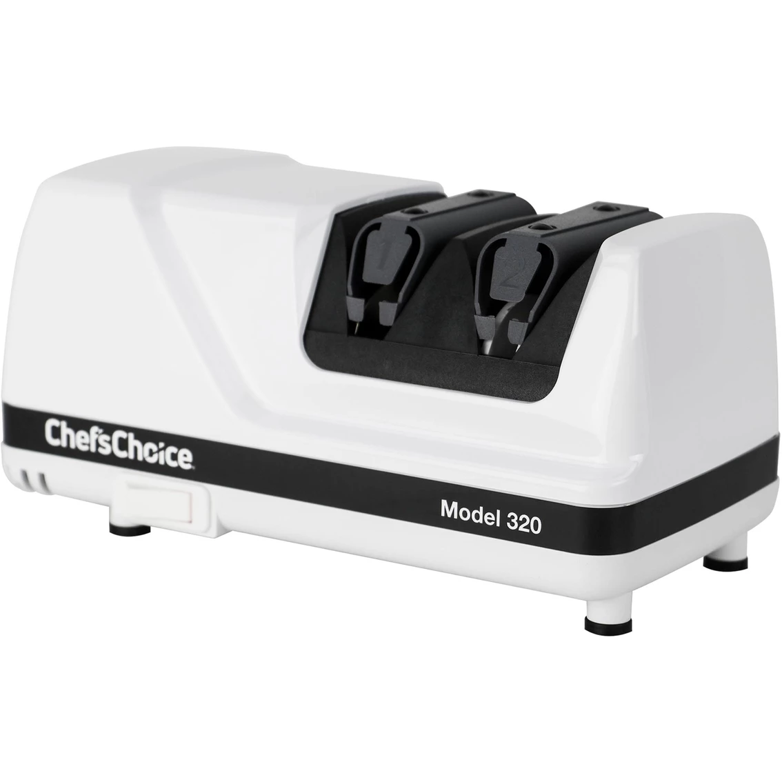 Compact and lightening fast, this Chef’s Choice Diamond Hone FlexHone/Strop Professional Knife Sharpener uses advanced technology to sharpen both fine edge (straight edge) and serrated knives. Durable 2-stage sharpening provides arch-shaped edges, which are stronger and longer lasting than hollow ground or conventional “V” edges. Stage 1 uses 100% fine diamond abrasives to create the first bevel, and Stage 2 ultra-hones the edge using advanced micron size 100% diamond abrasives to complete the second bevel. The precisely formed conical diamond abrasive disks gently apply optimal sharpening pressure, guaranteed to never detemper the edge. Highly-precise knife guides automatically position and stabilize the knife as you sharpen for fast, foolproof results. Ideal for sharpening all types of knives, including kitchen, household, sporting and pocket knives. Engineered and assembled in the USA. Model: 320.