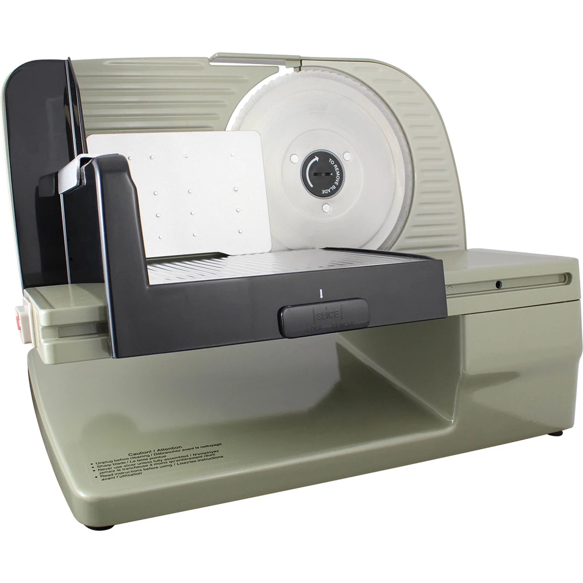 Handsomely styled and engineered for power, efficiency and smooth operation, the Chef’s Choice Electric Food Slicer is the perfect solution for home and professional chefs seeking innovative options for preparing meals, entertaining cost effectively, controlling portions and enjoying freshly sliced foods. Rugged, yet sophisticated and highly styled, the Model 615Aβs key components are constructed of cast aluminum and stainless steel. It boasts an impressive 120 watts power rating and is engineered with a cool running, high torque motor and reliable smooth gear drive for continuous slicing operation.; Its sleek construction includes a tilted food carriage for fast and efficient slicing. The food carriage is large and fully retracts to permit slicing of extra large roasts, hams and other foods. The food pusher is constructed of metal with an easy grip, non slip design. The Chef’s Choice Electric Food Slicer comes equipped with a 7 in. (17 cm.) stainless steel blade ideal for slicing a wide variety of foods. The precision thickness control slices from deli-thin to approximately one-inch thick. The unit features an intermittent and continuous on/off switch as well as a special button that secures food carriage in a lock position to limit access to blade when unit is not in use.; The Chef’s Choice Electric Food Slicer is easy to clean with a removable blade, food carriage, food pusher and thickness control plate. It weighs approximately 10 pounds. Model: 615A000.