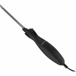 Precision slicing for home cooked meals is at your fingertips with the 8 in. Electric Carving Knife by Classic Cuisine. This sleekly designed knife helps to eliminate stressful holiday or party dinner preparations by not shredding your dinner and instead offering clean and evenly cut food. This knife is also equipped with a powerful 100W motor and a durable serrated blade. With the hand contoured grip and a safety finger guard, this knife will provide a safe and reliable experience. The quick release eject button allows you to remove the blade from the power attachment for a hassle-free post dinner cleanup. Additionally, the 62 in. cord allows you to move with ease, offering you the most precise cutting positions without being limited by the cord of your knife. Includes handle with cord and blade. Model: M030215.