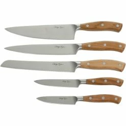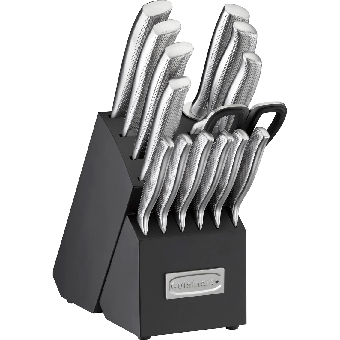 The set includes a 3 1/2 in. paring knife, six 4 1/2 in. steak knives, 5 1/2 in. serrated utility knife, 7 in. santoku knife, 8 in. chef’s knife, 8 in. slicing knife, 8 in. bread knife, honing/sharpening steel, all-purpose shears and a 14-slot wood storage block. Model: C77SS-15PG.