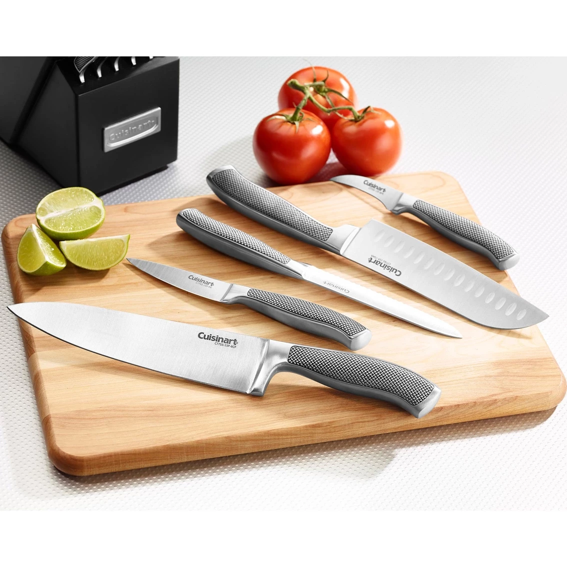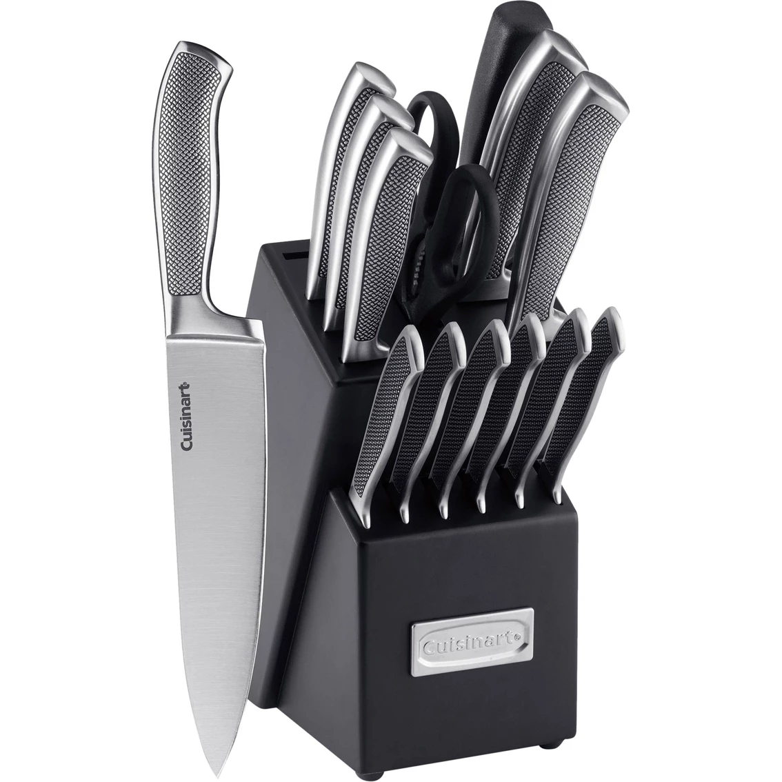 The Cuisinart Graphix collection 15 pc. stainless steel cutlery block set includes a variety of pieces. The set features a chef”s knife, slicing knife, santoku knife, serrated utility knife, paring knife, bird’s beak paring knife, six steak knives, sharpening steel, all-purpose household shears, plus a storage block to keep everything protected and organized. From heavy-duty chopping to intricate slicing to keeping it all sharp, you’ll have the perfect tool for every cutting task with this must-have set. Cuisinart will look beautiful on your kitchen counter top.
