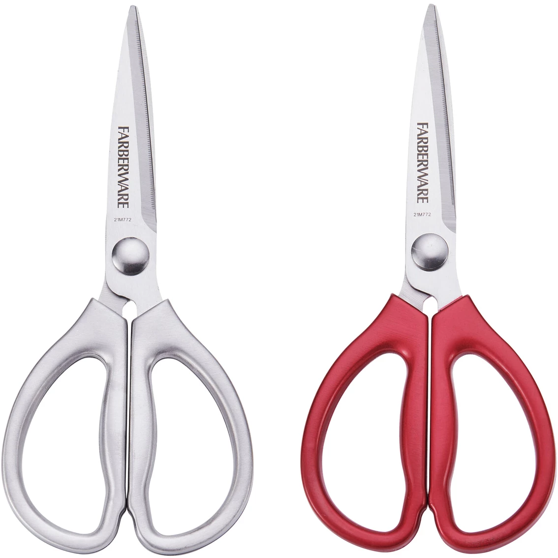 This Farberware set of two Metallic Scissors in red and stainless steel is essential for any kitchen. The scissors feature tough stainless steel blades and comfortable, nonslip handles that allow for easy use during your common kitchen cutting and prep tasks. To clean, hand wash with warm water and a mild detergent and then rinse and dry immediately. Lifetime Limited Warranty. Model: 5292801.
