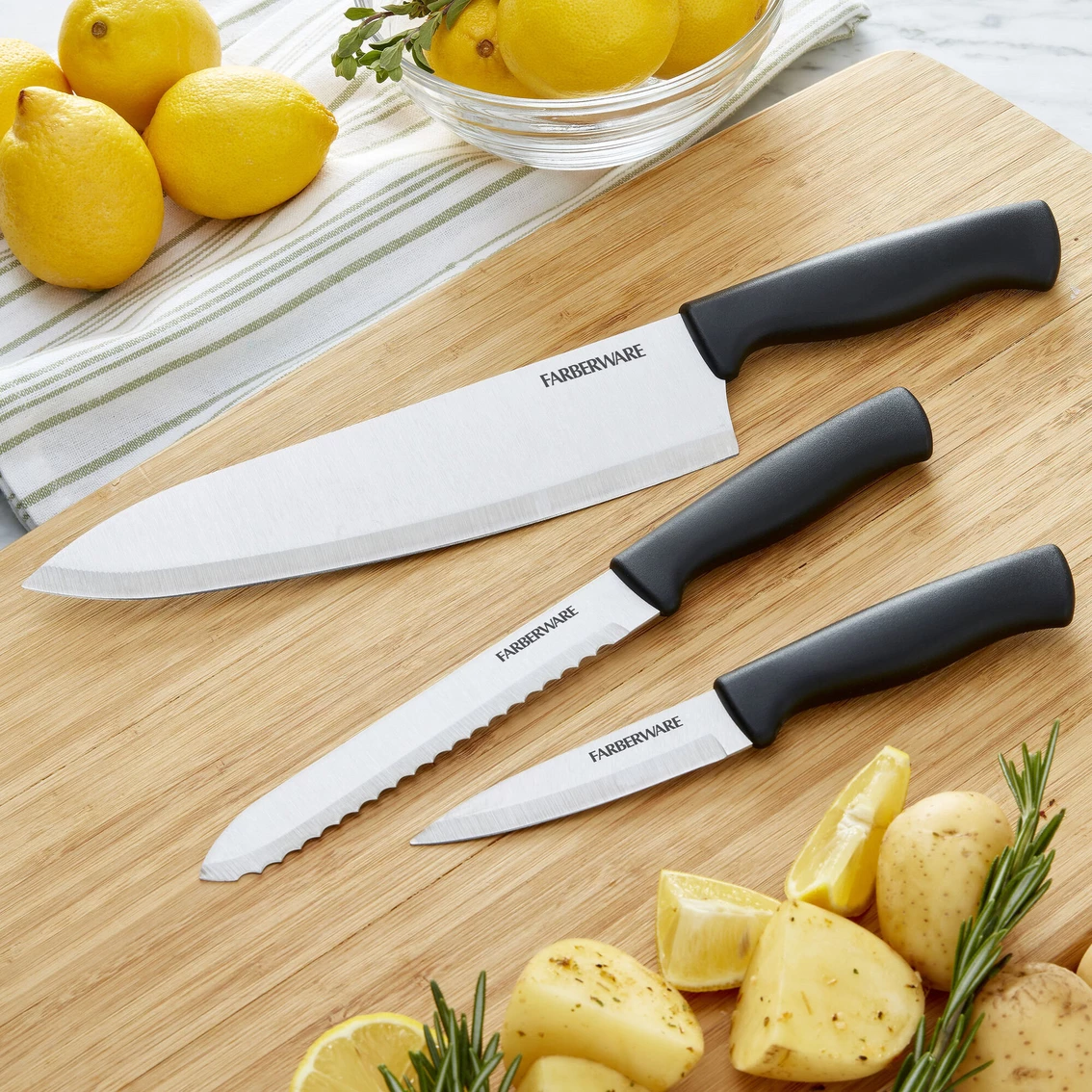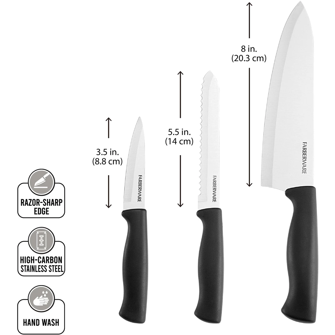 Add essential everyday knives to your kitchen while always having the right knife on hand with this Farberware 3 Piece Chef Set. This knife features a high-carbon stainless steel blade and is perfectly weighted for balance and control when cutting.