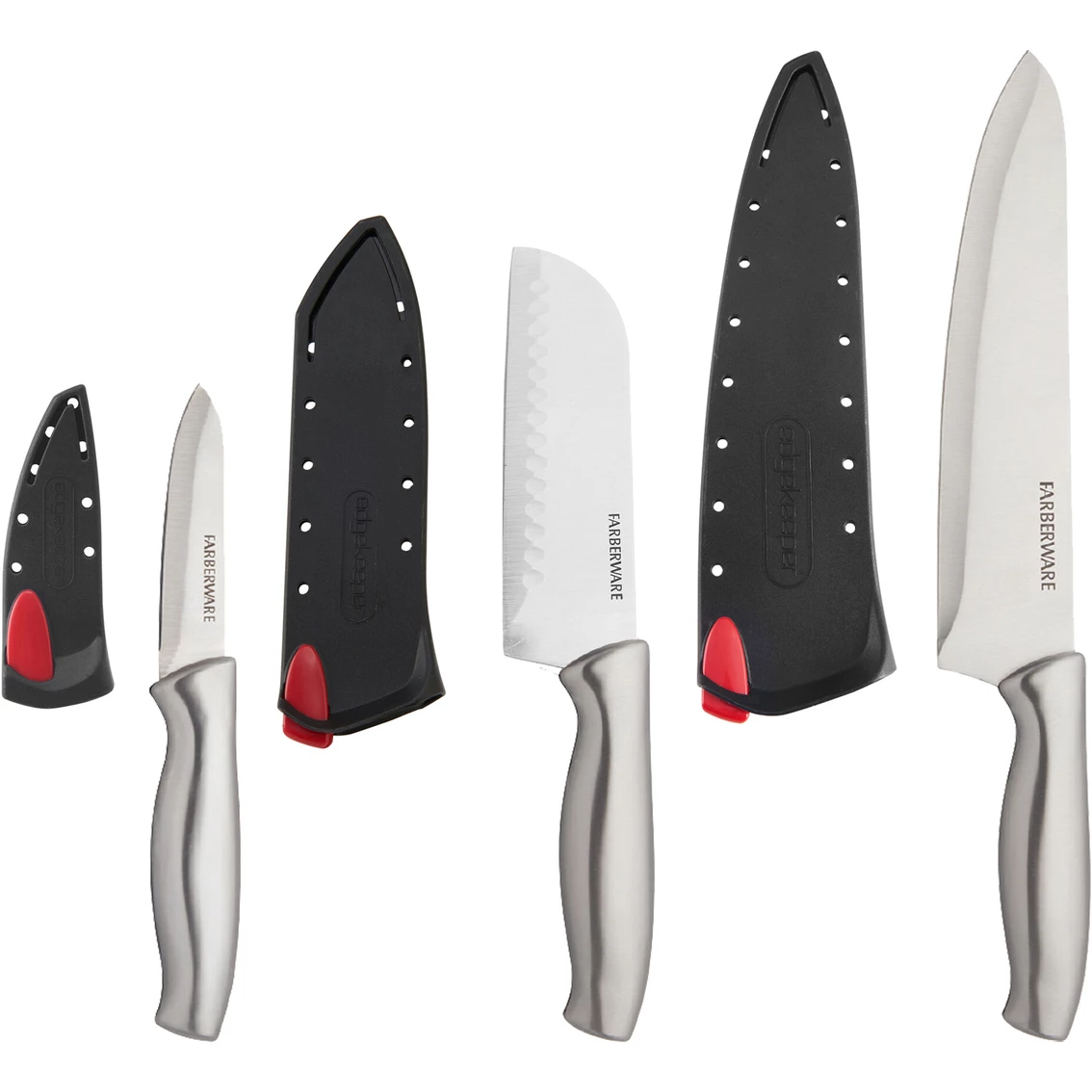 This Farberware Edge Keeper Stainless Steel Chef Cutlery 6 pc. set is an ideal way to keep sharp cutting tools at hand at all times. Knives feature stainless steel blades with cullens that help keep food from adhering to the blades while cutting, and the ergonomically designed, stunningly attractive stainless steel handles offer comfort and control. The Edgekeeper sheaths are each designed with a built-in knife sharpener that creates a sharp blade every time the knife is inserted or removed. The self-sharpening sheaths also keep the knives protected while in storage. Hand-wash with warm water and a mild detergent; rinse and dry immediately. Model: 5277621.