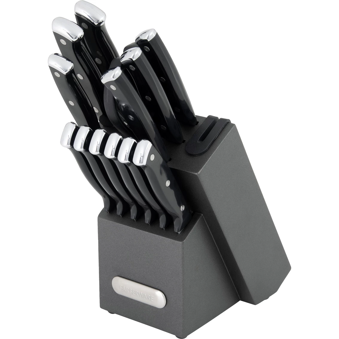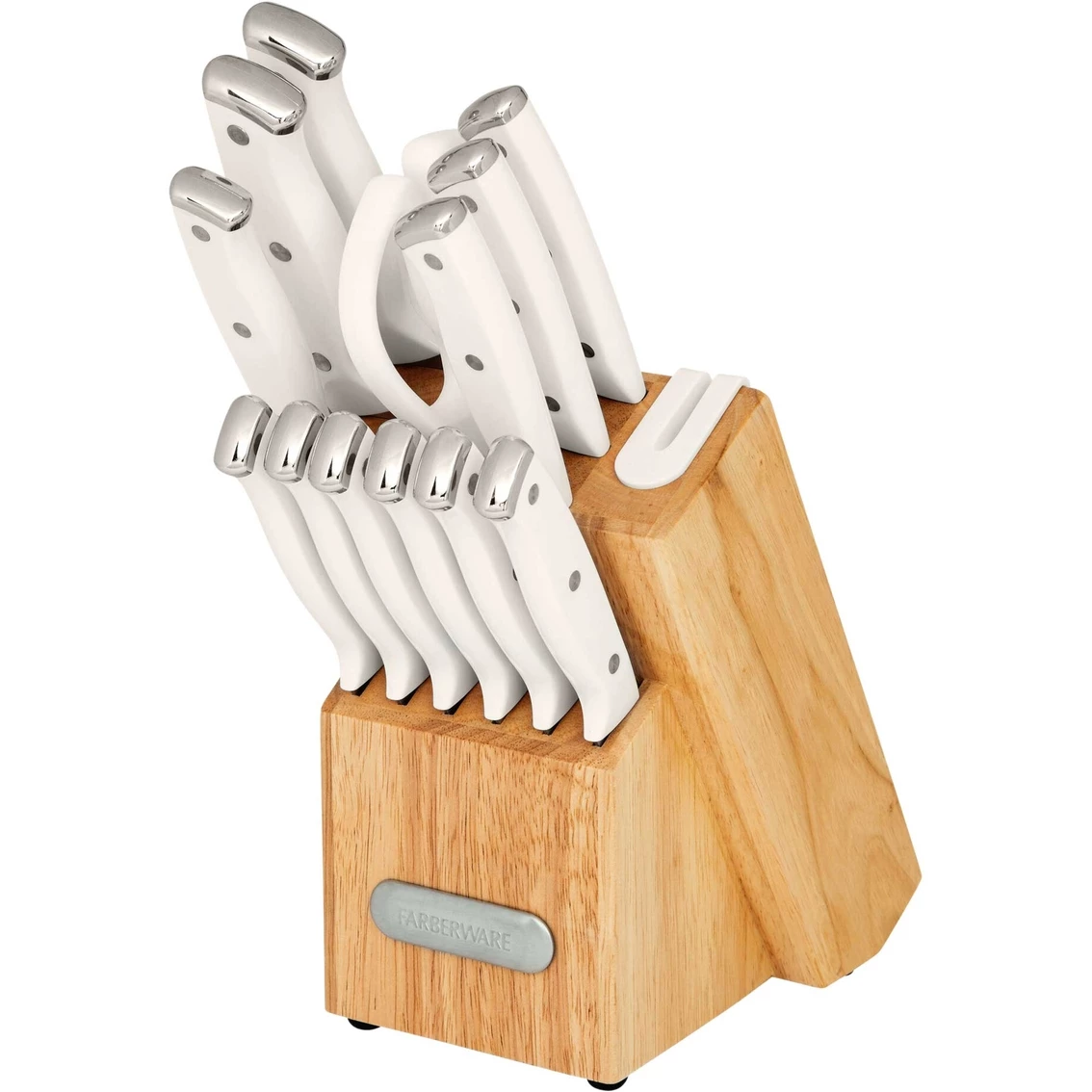 Always have the right sharpened knife on hand, with this Farberware Triple Rivet Cutlery Block Set with Built-In Edgekeeper Sharpener. Each knife has a fine edge, high-carbon stainless steel blade and ergonomically designed plastic handle that provides a comfortable grip. The set features handles with triple rivets and endcap accents in a natural hardwood block that complements any decor and keeps all your essential knives organized and within reach on your countertop. This unique block also features an Edgekeeper Sharpener slot. If you need to sharpen a blade, simply slide it through the slot for a quick and convenient edge enhancement. Model: 5285899.