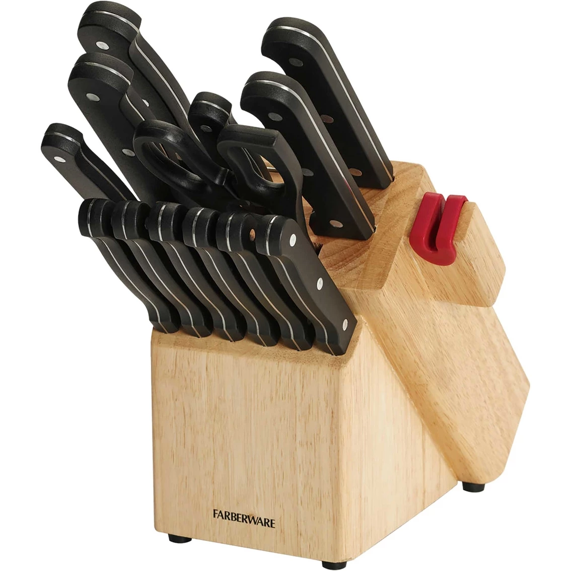 This Farberware Edgekeeper Cutlery 14 pc. Set includes: 8 in. chef, 8 in. slicer, 6 in. cleaver, 5.5 in. serrated utility, 3.5 in. parer, 6 steak knives, shear and a natural finish block with built in sharpener. Features a traditional triple rivet handle and superior high carbon stainless steel blade. Complete with lifetime limited warranty. Model: 5150388.