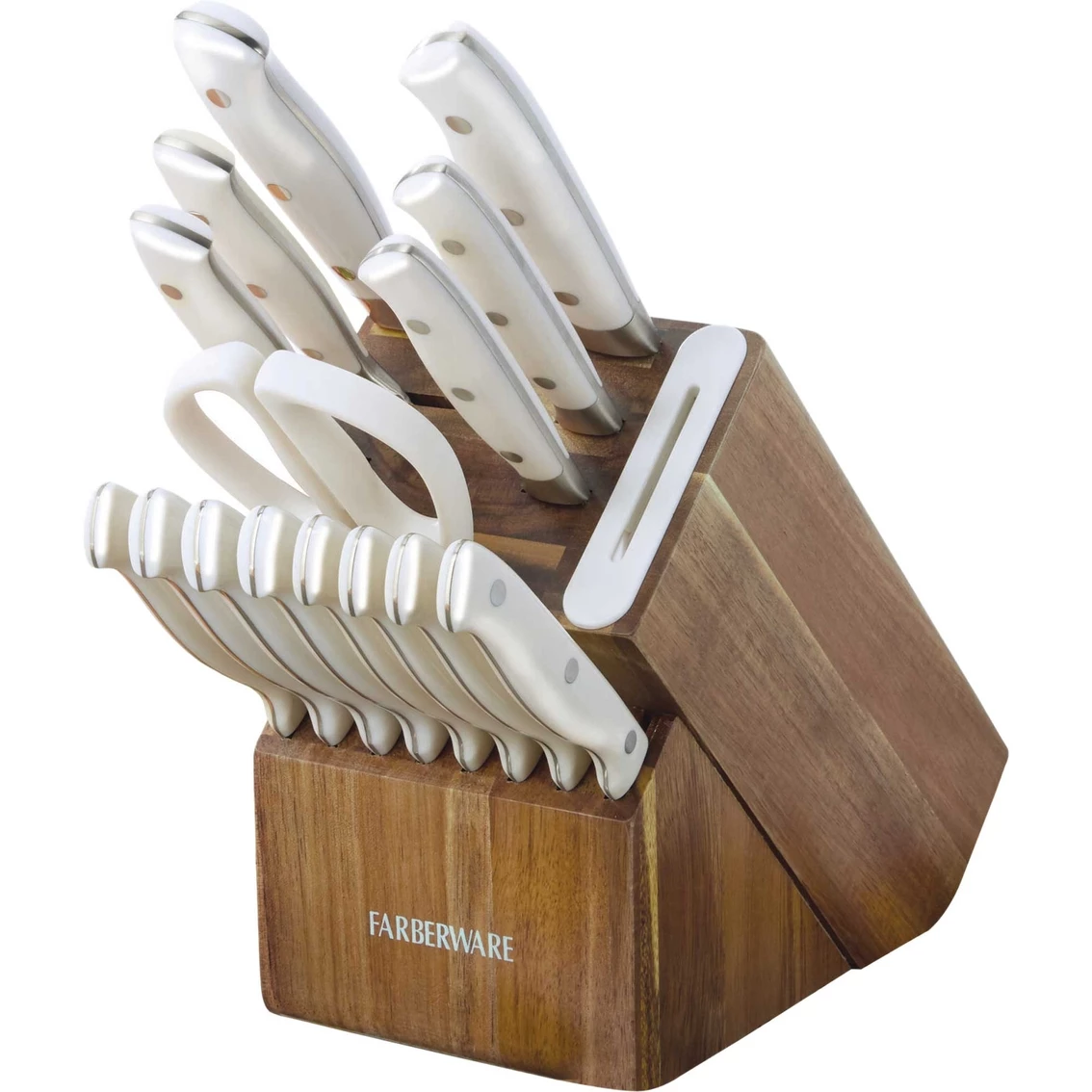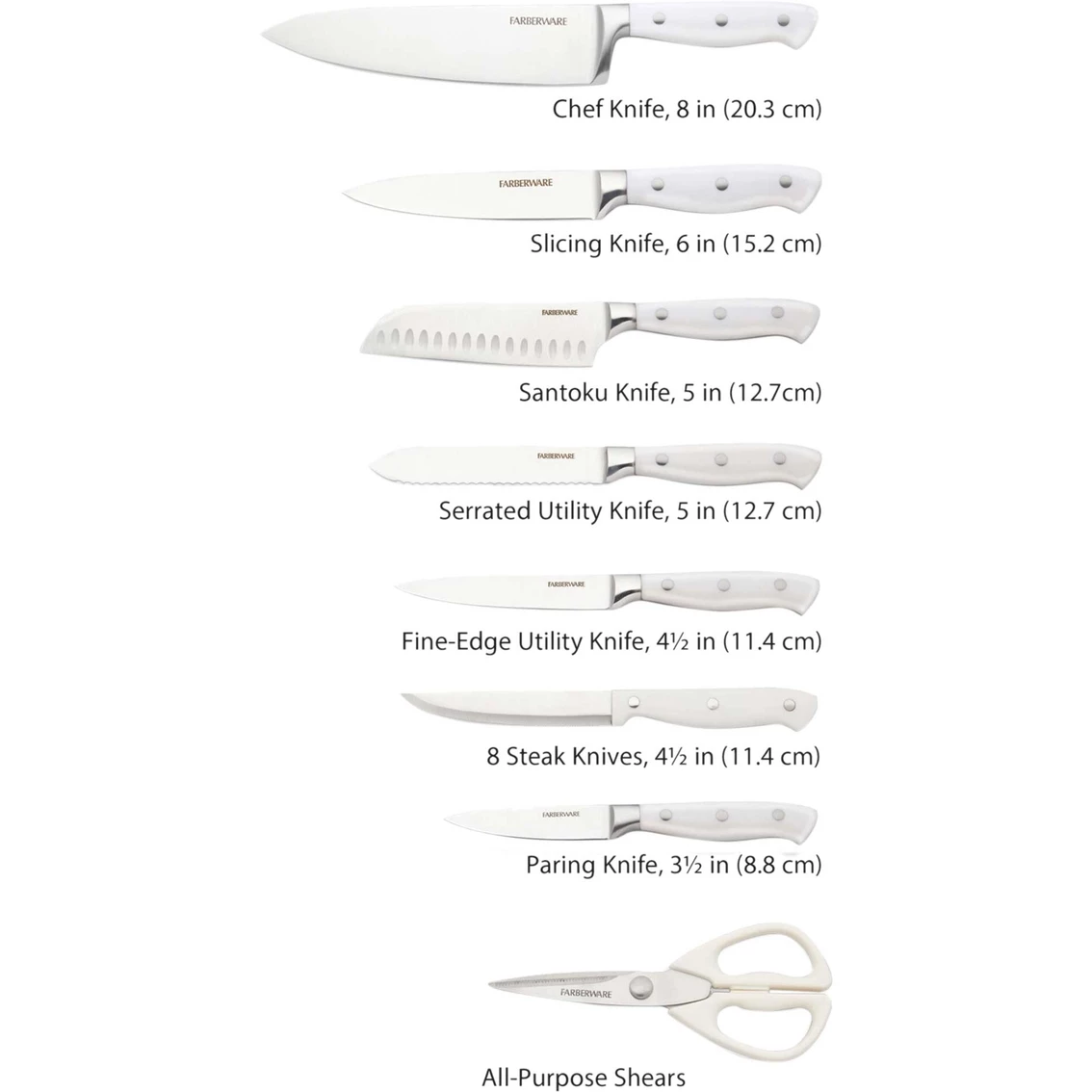 This Farberware 16-Piece, Forged Triple-Riveted White Handle Cutlery Set is a sleek addition to a modern kitchen, and includes all the essential knives for everyday food prep tasks.