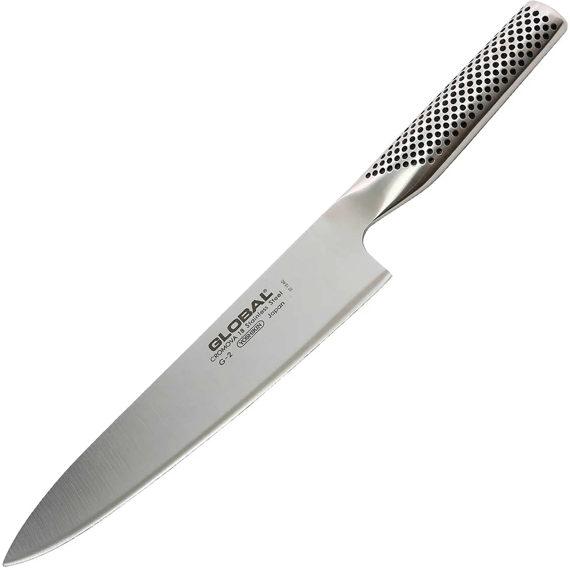 Global Knives have two most innovative features – their edge and the way they are balanced. The most important feature of any knife is its edge. The blade is made from one of the finest steels- CROMOVA 18 stainless steel. This special steel is ice-tempered and hardened to a Rockwell Hardness of 56-58, which remains razor sharp longer than any other steel and resists rust, stains and corrosion. The blade edge is ground on both sides of the blade like western style blades; however the edge is ground to a straight point rather than a beveled edge which results in a razor sharp edge that will stay sharper longer. To balance the blade, all Global knives have a unique hollow handle filled with the right amount of sand to create the perfect balance.