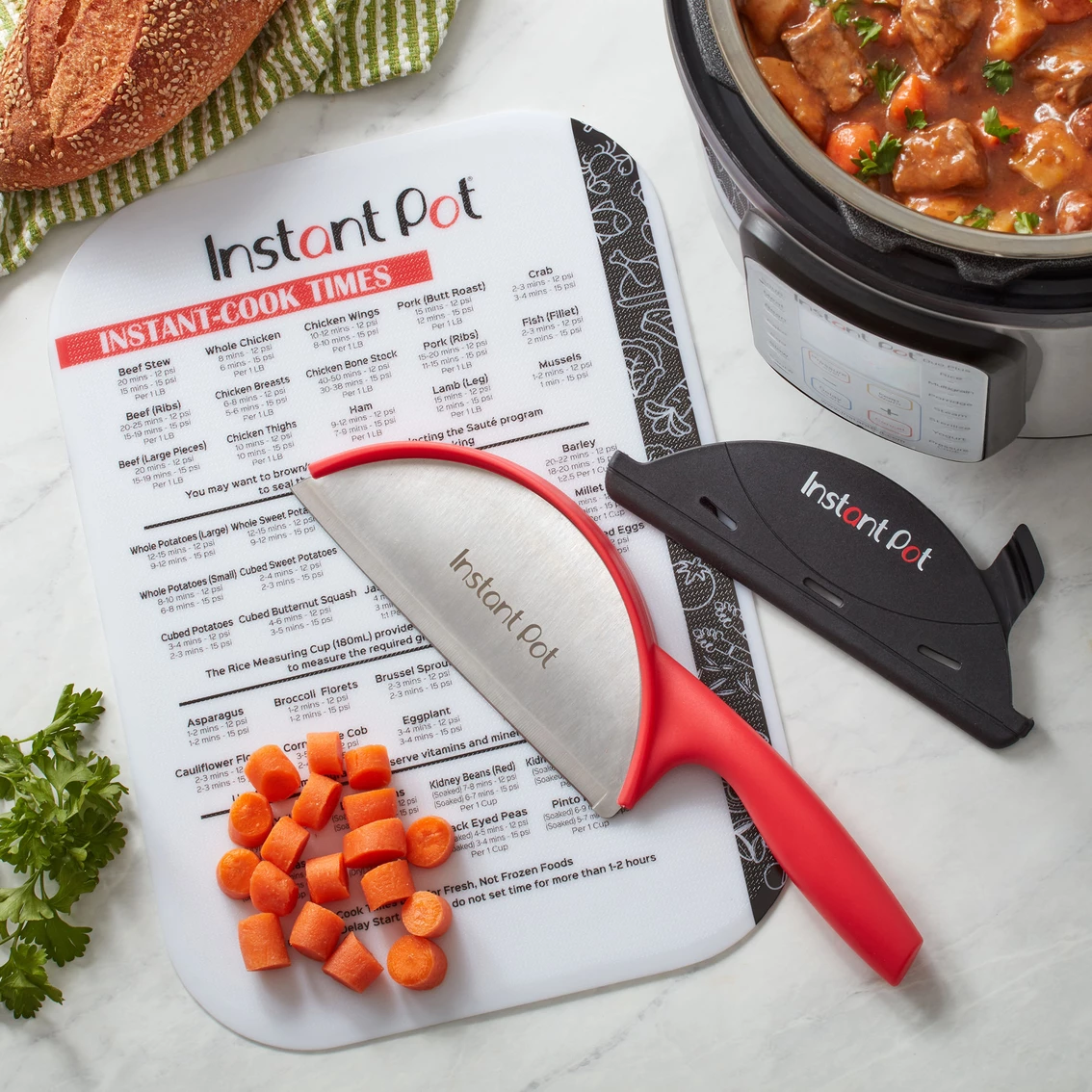 Get two Instant Pot pressure cooker essential accessories in one convenient set. Specially designed for use with Instant Pot pressure cookers. The Instant Pot Official Chop And Slide Knife with locking Blade Cover and sweeper is specially designed to easily chop, sweep, and transfer food into Instant Pot. The locking blade cover does double-duty, working as a protective cover for the knife when it’s not in use, but also works as a food sweeper to transfer foods from board to blade then blade to pot. The knife’s curved design allows a deep walled surface area to fit all your chopped foods. The ergonomically designed handle fits nicely in your hand, making the knife more comfortable when in use. Knife and blade cover not meant for use in your Instant Pot. Do not use either of these tools as a scraper inside your Instant Pot. Hand wash only. The Instant Pot Official 10 x 14 in. Cutting Mat features recommended cook times and PSI (pounds per square inch) information for some of the most popular Instant Pot ingredients/recipes.