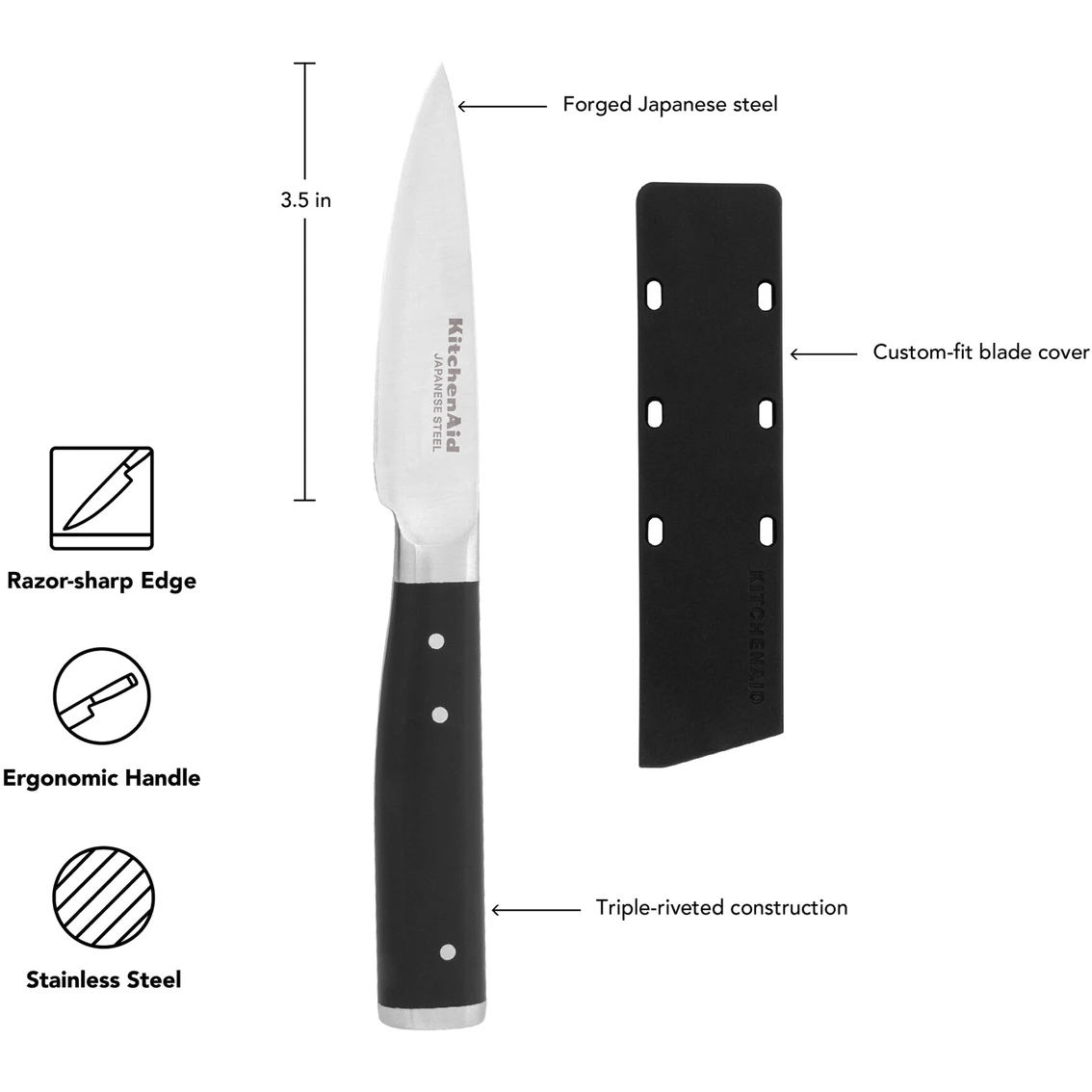 A food prep essential, this KitchenAid 3-1/2 Inch Paring Knife features a high-carbon Japanese steel blade hardened and tempered to provide a long lasting edge for a professional, quality cut every time. The knife is perfectly sized for more control when cutting, trimming, mincing, and garnishing. The black plastic handle features a sleek, triple pin riveted design and attractive silver end cap. Includes a sheath to protect the blade and ensure safe, secure storage. Dishwasher safe. Model: KO35ASSOHOBA.