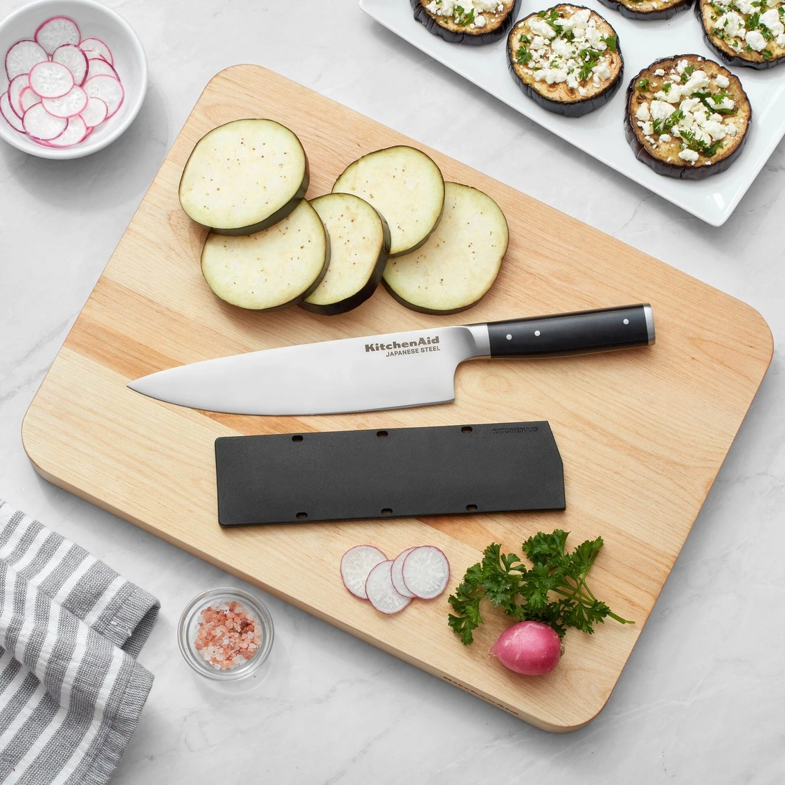 Take on a variety of everyday cutting tasks in the kitchen with this KitchenAid 8-in. Chef Knife. The high-carbon Japanese steel blade provides a long lasting edge for a professional, quality cut every time. The black plastic handle features a sleek, triple pin riveted design and attractive silver end cap. This knife comes with a sheath to protect the blade and ensure safe, secure storage. Dishwasher safe. Model: KO8IFSSOHOBA.