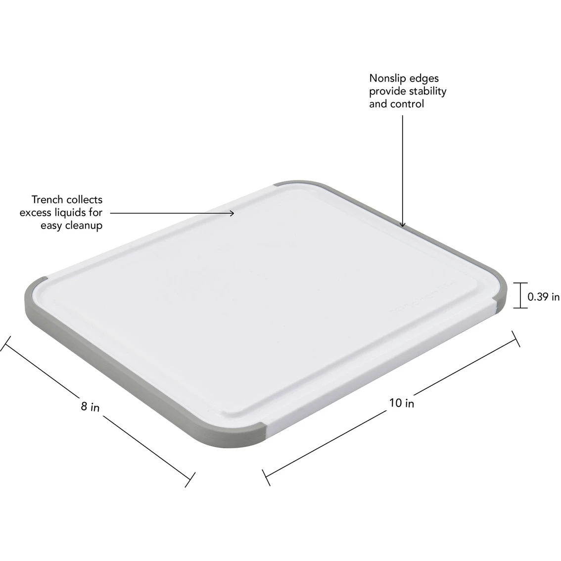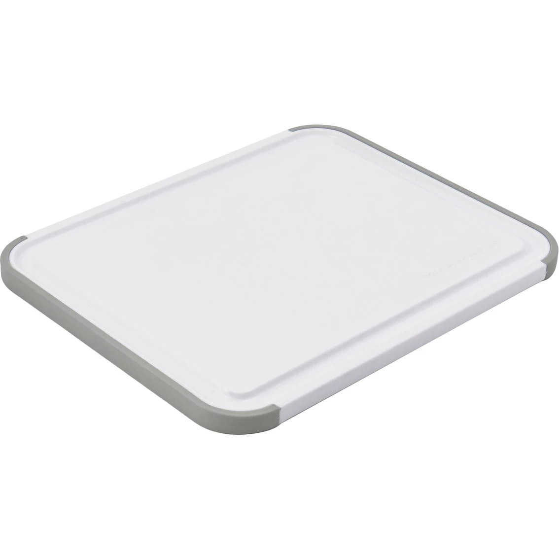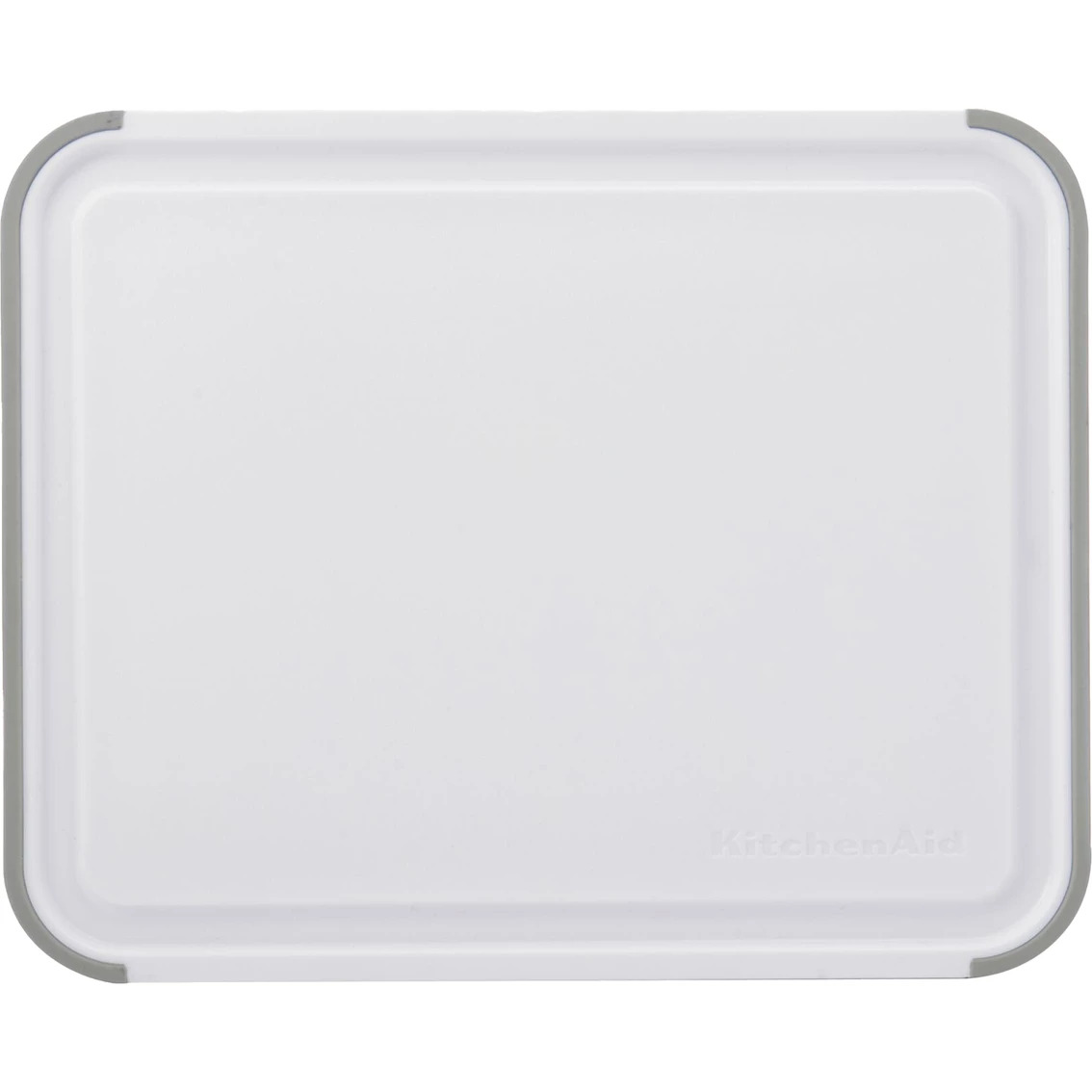 This KitchenAid Classic 8 x 10 in. White and Gray Cutting Board is the ideal size for everyday food prep tasks. Made of plastic, it is non-absorbent so it won’t retain odors. It’s gentle on blades so it won’t dull knives, and reversible to double the cutting surface and help prevent cross-contamination. The nonslip, gray rubber edges provides stability on countertops, and a drainage groove frames the board to catch juices and cut down on messes. Measures 8 in. x 10 in. Dishwasher safe. Model: KE701NOSMGA.