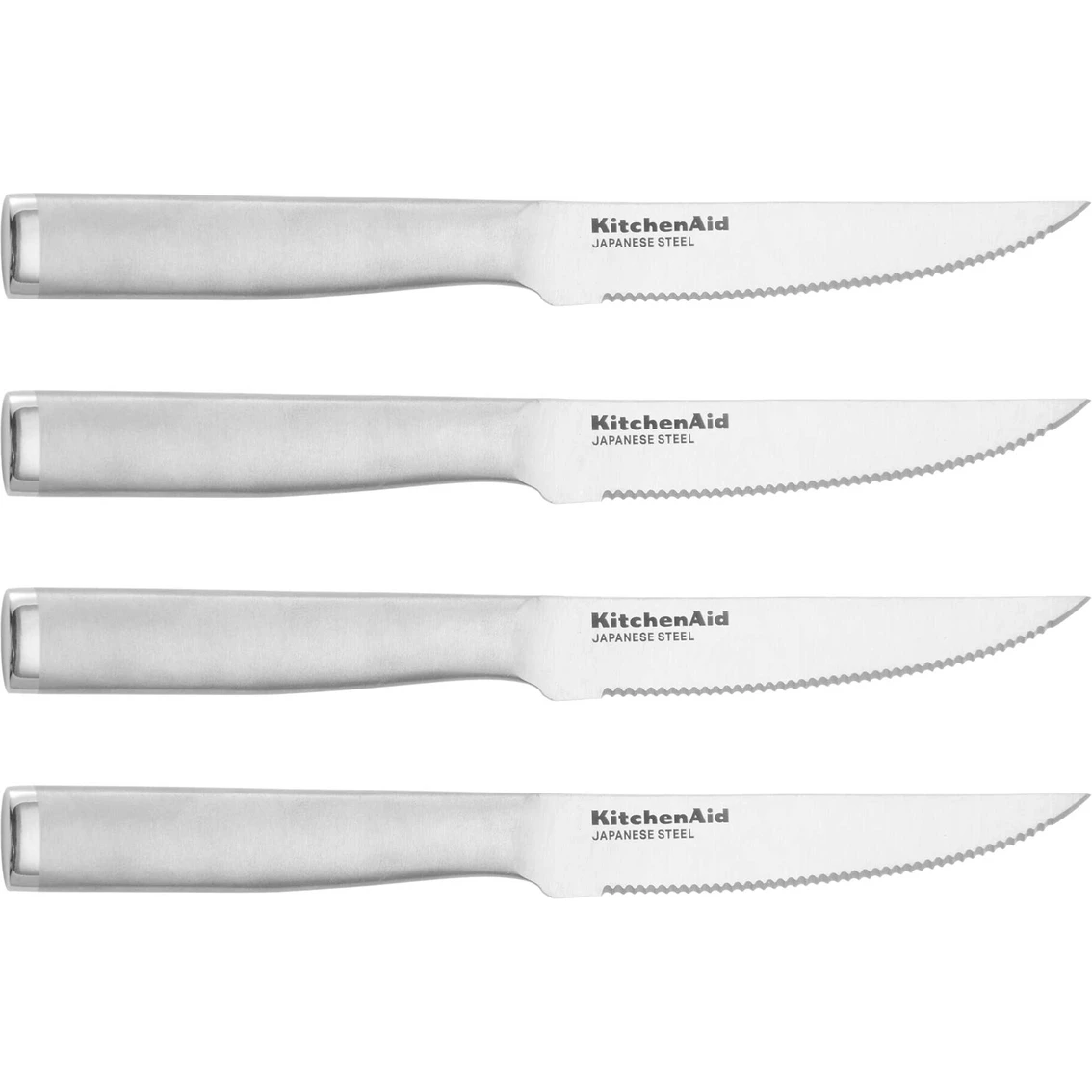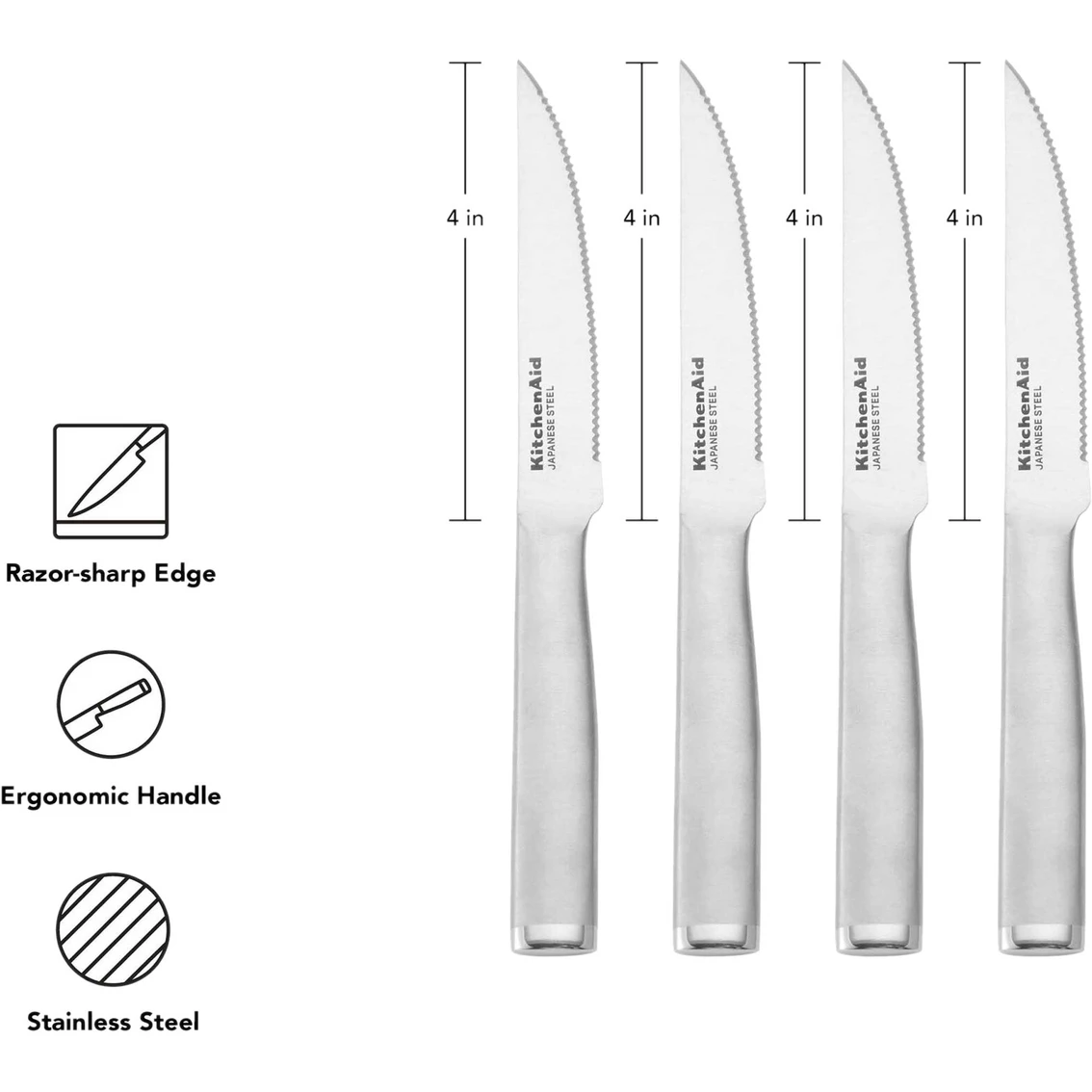Ideal for everyday dining, this KitchenAid set of four 4.5-inch serrated steak knives features forged, high-carbon imported Japanese steel blades and tempered to provide a long-lasting edge and cut easily through a variety of meats and poultry. These KitchenAid knives feature eastern-style ergonomic handle that provides optimal control for everyday use. These handles are expertly engineered in a brushed stainless steel finish for a comfortable grip, and accented with a polished endcap. KitchenAid knives are top rack dishwasher safe. To extend the life of your cutlery, hand washing is recommended. Dry immediately. Model: KO45SKFOHSSA.