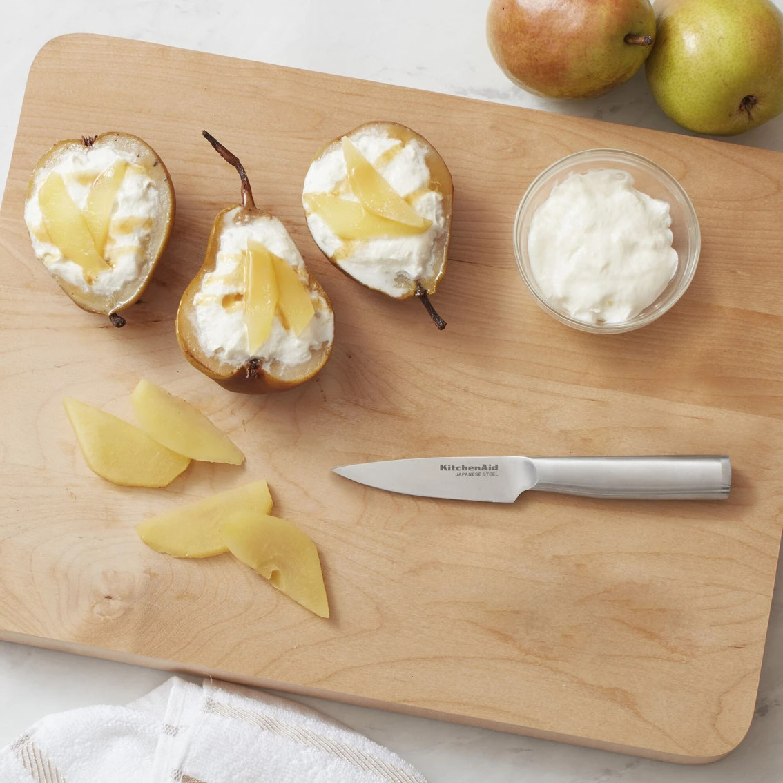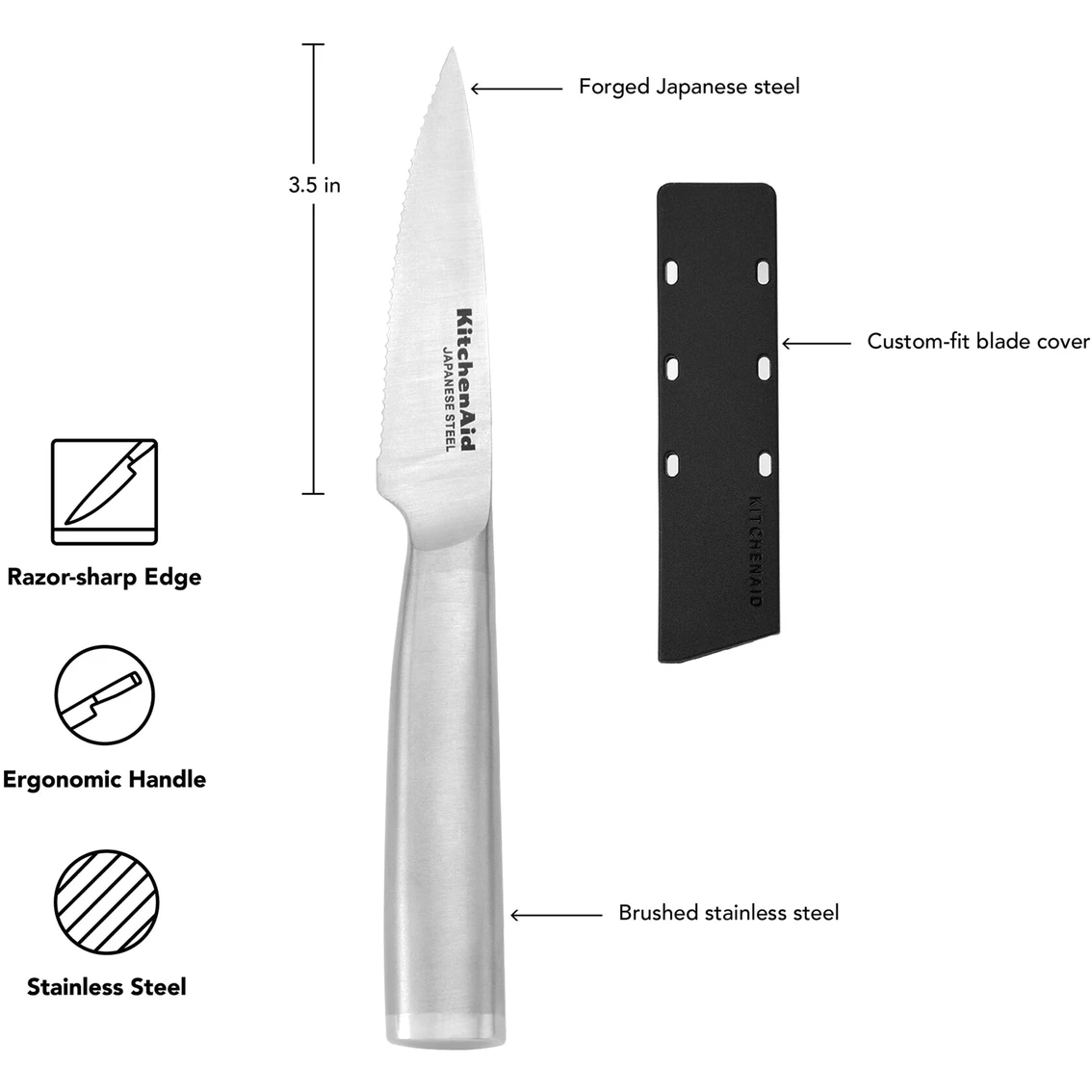 The KitchenAid paring knife is ideal for small everyday food prep needs, from cutting delicate fruit to slicing up a snack. This forged knife is expertly crafted using semi-polished, high carbon imported Japanese steel, hardened and tempered to provide a long-lasting edge for a professional, quality cut every time.