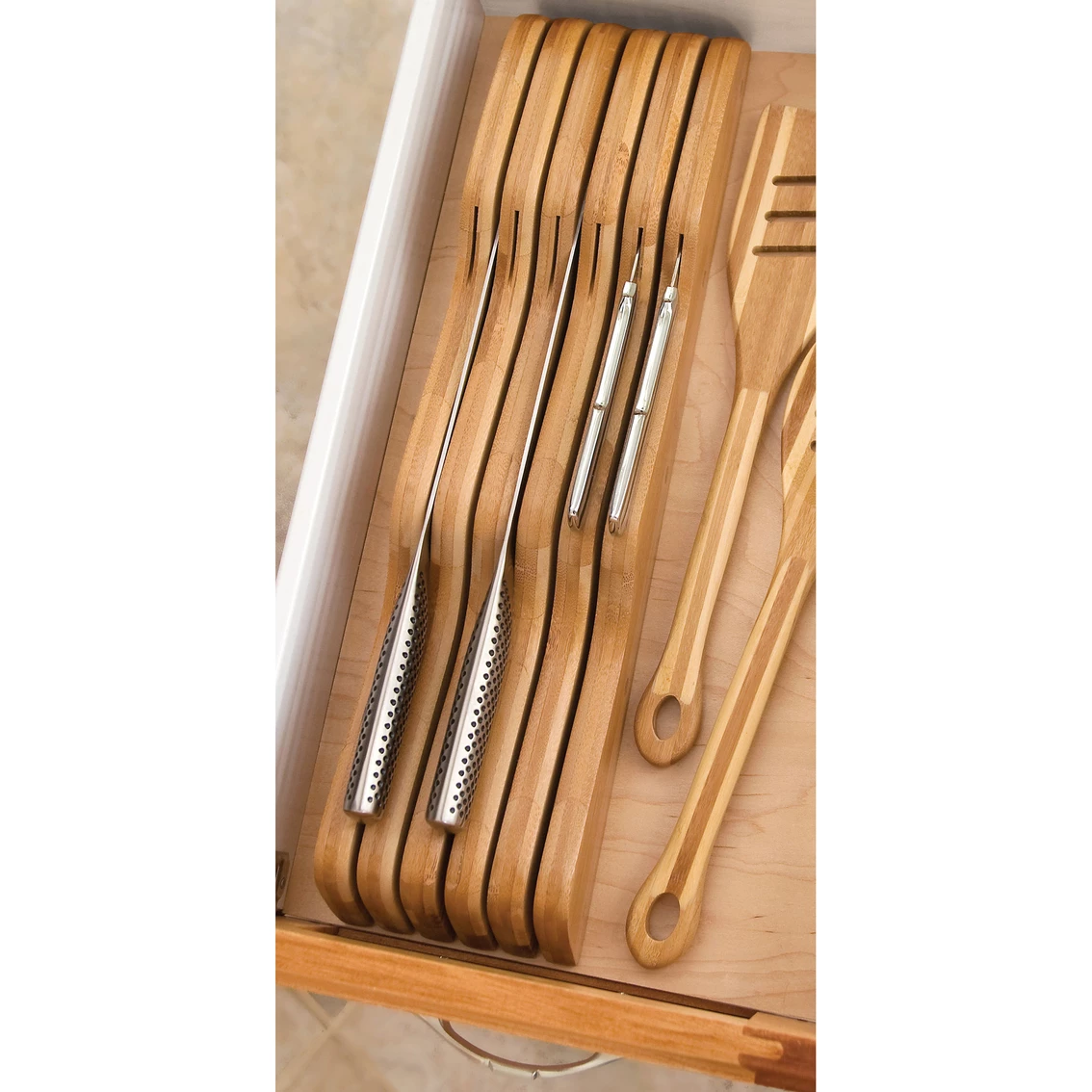 Bamboo block holds five chef’s and six paring/steak knives (not included).