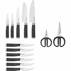 | Includes | 1- 8 in CHEF KNIFE1- 8 in BREAD KNIFE1- 7 in SANTOKU KNIFE1- 5 in UTILITY KNIFE1- 3.5 in PARING KNIFE6- 4.5 in STEAK KNIVES1- SCISSOR1- SHARPENER1- BLACK BLOCK3CR13 1.7/1.4MMABS HANDLE 5PLYMATTETAPER |
