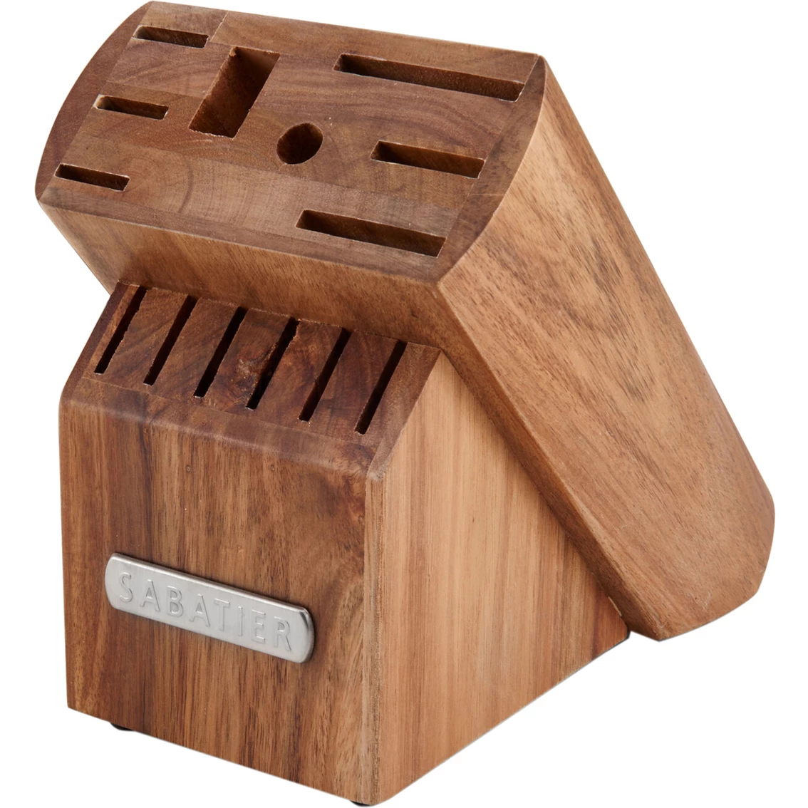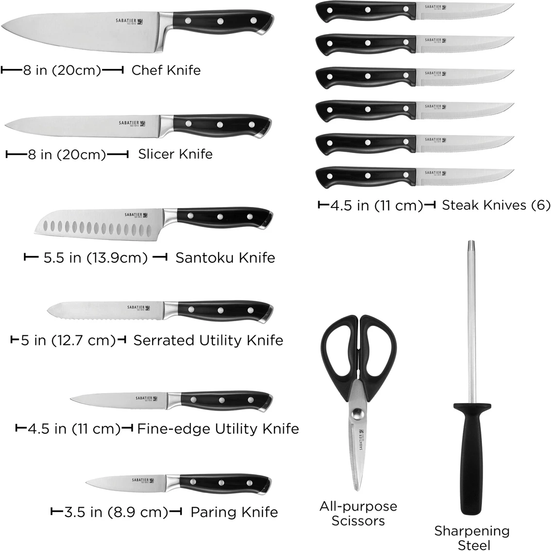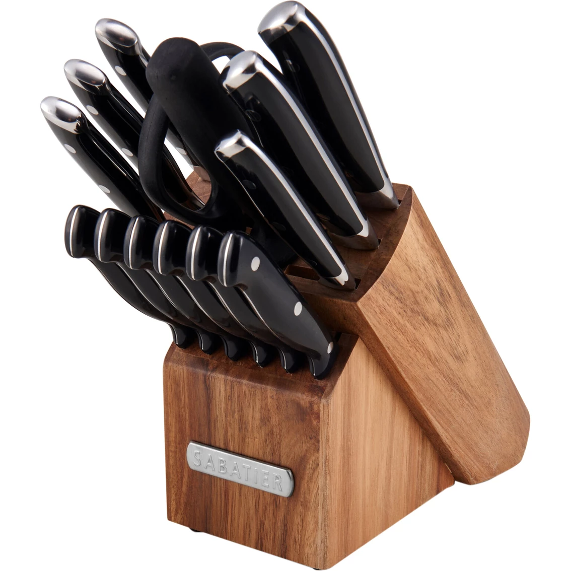 Add a touch of timeless style to your kitchen decor while always having the right knife on hand with this Sabatier 15-Piece Black Forged, Triple-riveted Cutlery Set in Acacia Wood Block. Each knife blade is expertly crafted from superior-quality, high-carbon stainless steel for optimal cutting performance. Forged, triple-riveted black handles are perfectly weighted for balance and control and ergonomically designed for comfort while cutting. All components store neatly in the attractive acacia wood block so they are always right at your fingertips on a counter.