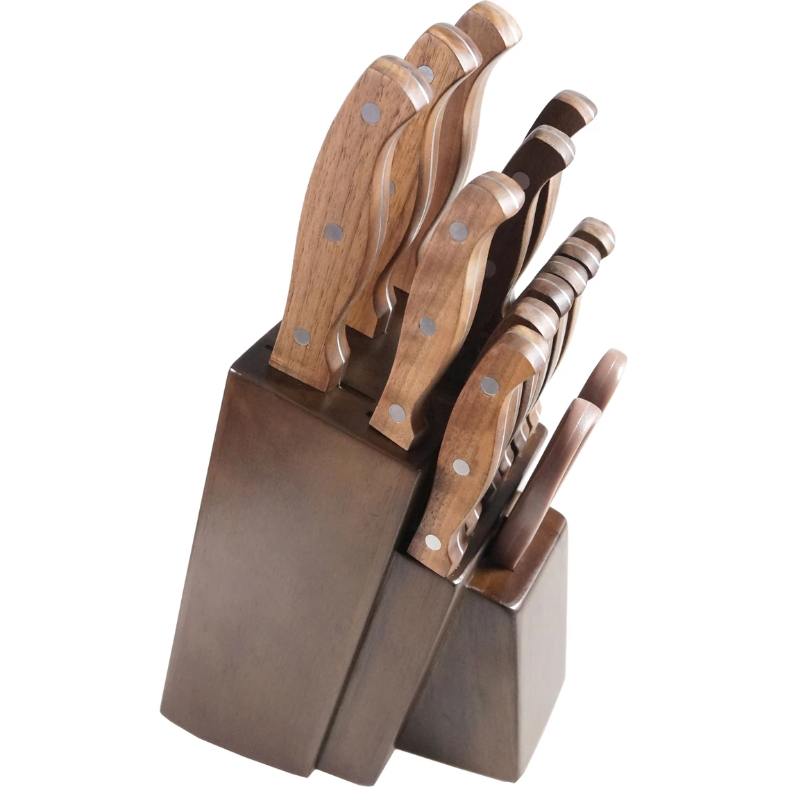 | Includes | Bread Knife, Santoku Knife, Boning Knife, Utility Knife, Paring Knife, Peeling Knife, 6pcs Steak knives, Kitchen Shears, Walnut Stain Wooden Block |