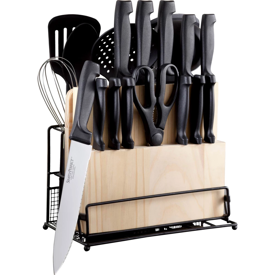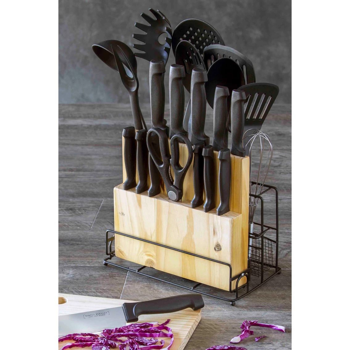 Enjoy this 25 pc. cutlery center that comes complete with a wood knife block, cutting board and organizational wire basket. You get seven of the most used knives in any professional kitchen, including kitchen shears and a set of six steak knives. Designed for comfort and durability, these high-quality stainless steel knives have tempered, stainless steel blades that never need sharpening. Includes: stainless steel whisk, 8 in. chef knife, 8 in. bread knife, 6 in. boning knife, 8 in. carving knife, 5 in. tomato knife, six 4 1/2 in. steak knives, 3 1/2 in. paring knife, kitchen shears, nylon spaghetti server, nylon pasta fork, nylon skimmer, nylon slotted spoon, nylon ladle, nylon slotted spatula, nylon large slotted spatula and nylon solid spoon.