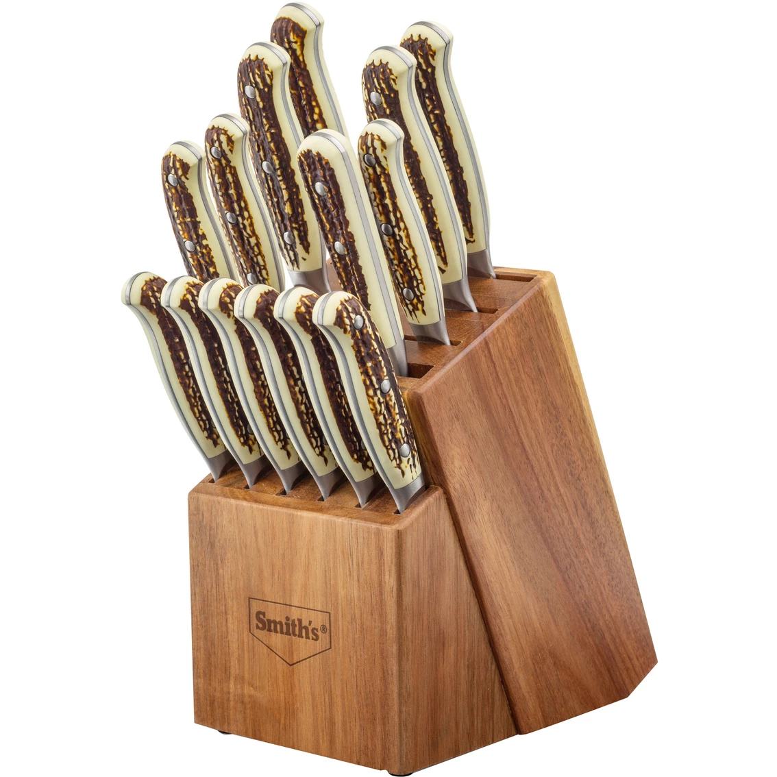 Smith’s Cabin and Lodge 15 pc. set includes the most useful knives needed in any kitchen, and a six-piece steak knife set, and their own hardwood storage and display block. Hand washing is required to keep your knives in superior condition. Each of these Cabin & Lodge knives addresses a real need in the kitchen of the casual cook, or those with a more ambitious flare. Each knife leaves the factory with a precise edge that will make your cutting chores a breeze.