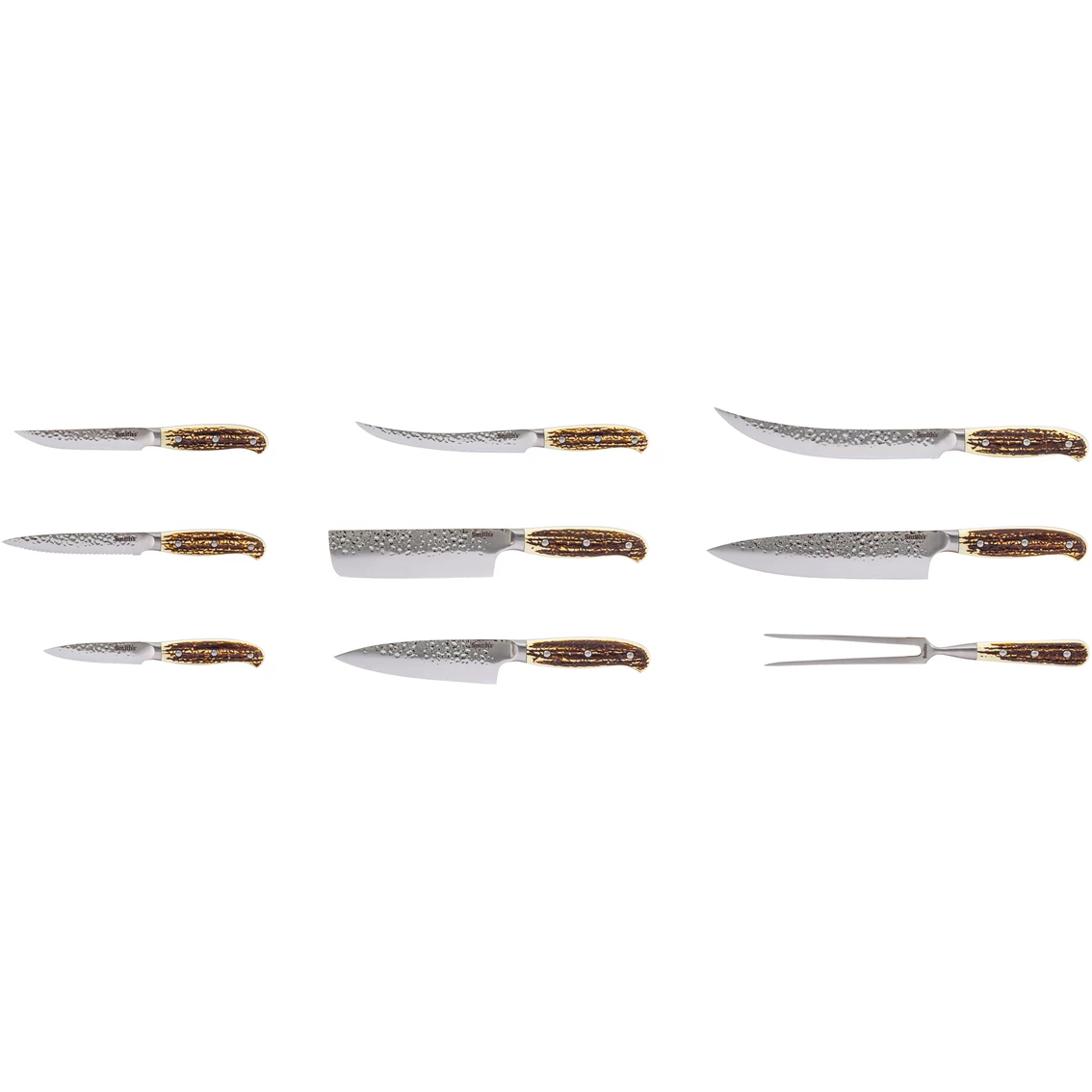 Set Includes: 1- Chef Knife: 8 in. 1- Breaking Knife: 8 in. 1- Chef Knife: 6 in. 1- Cleaver: 6 in. 1- Fork: 6 in. 1- Curved Fillet : 6 in. 1- Serrated Utility Knife: 5-1/2 in. 1- Paring Knife: 3.5 in. 6- Steak Knives. 1- Wood Block.